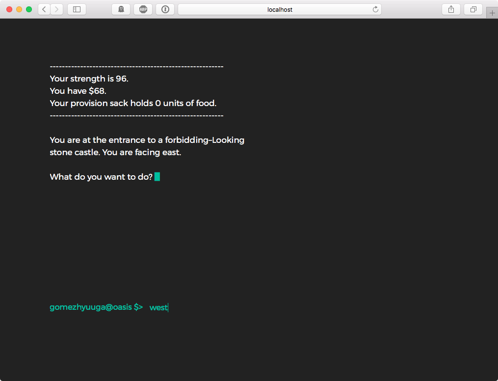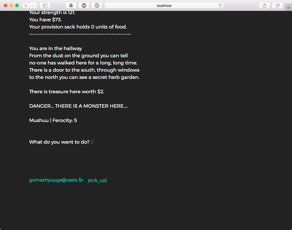 north, south, east, west: move to north, south, east or west, respectively.up, down: if there is any stair, move upstairs or downstairs, respectively.tally: get the stats so far, including how many monsters have you killed, food amount, life points and your strength.consume: if you have food, consume1 unit.pick_up: if there is a treasure in the room, pick it up.magic: use a magic power to move to another random room.