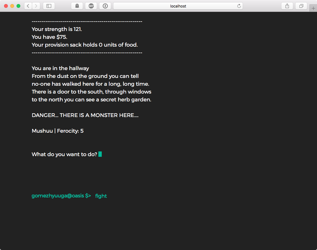 fight: choose to fight a monster if it is present in the room.run: run from the monster if you don’t want to fight. You have to choose where to run (north, south, east, west).